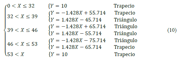 Ahora extraemos de manera conveniente los rangos para cada función de membresía, para describir cada uno de estos empleamos la ecuación de la recta punto pendiente y obtenemos: