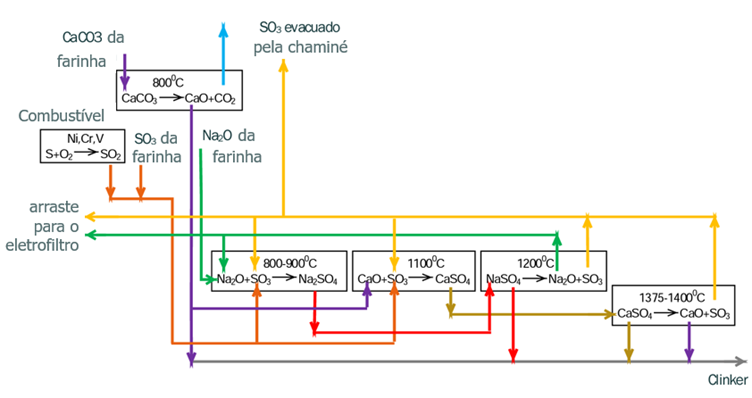 | Feijoo et al., Cuba, 2016. CEI, 2012. | Faça um balanço das principais reações químicas que o enxofre sofre durante o processamento do cimento. | Sistema de monitoramento químico estequiométrico. É baseado no cálculo da massa molar do enxofre e suas reações químicas. | Ele detecta valores de referência padrão de SO3 e Na2O, necessários para que o processamento do cimento ocorra de forma otimizada. | Este sistema permite saber quando estratégias devem ser aplicadas para evitar anéis de enxofre no forno. | |||||||||||||||