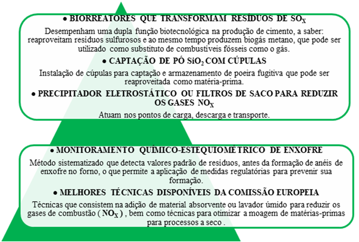 Para minimizar os resíduos de NOx, SOx e SiO2 durante o processamento industrial do cimento, é necessário considerar as propriedades químicas da matéria-prima utilizada, a aplicação de estratégias ecoeficientes como a substituição de combustíveis fósseis, o projeto de sistemas de a captação de resíduos, o uso de nanotecnologia (Poudyal e Kushal, 2021) e outras estratégias que resultam nesse objetivo, tanto a curto, médio e longo prazo. A Tabela 1 analisa várias estratégias que foram aplicadas no México e em outros países para reduzir a emissão desses resíduos.