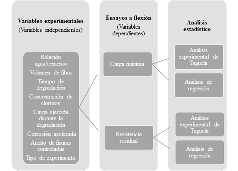 Como parte del procedimiento seguido en esta investigación, primeramente, se identificaron las variables experimentales que se han estudiado a lo largo del tiempo al realizar ensayos a flexión de SFRCs que, han sido previamente expuestos a degradación por cloruros y cuya variación influye de manera directa en las propiedades mecánicas de carga máxima y resistencia residual. Para el análisis de los datos obtenidos se utilizó el diseño experimental de Taguchi mediante la ayuda del Software Minitab (Minitab 17.0), además se hizo un análisis de regresión donde se corroboró la influencia de las variables experimentales en la variable de respuesta (ver Figura 1).