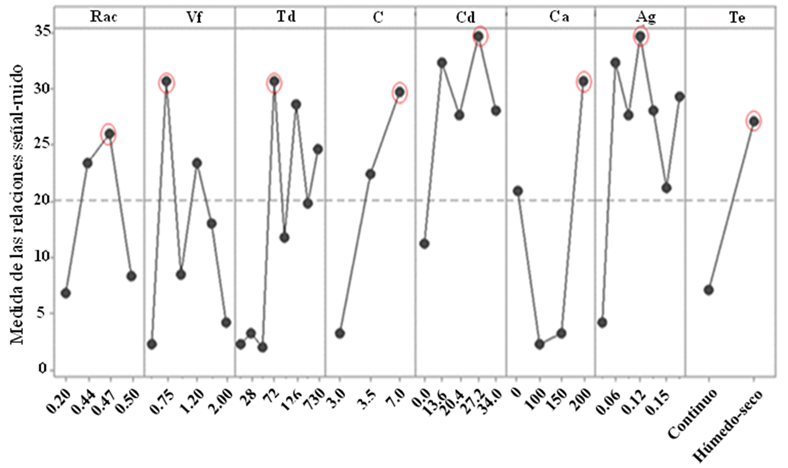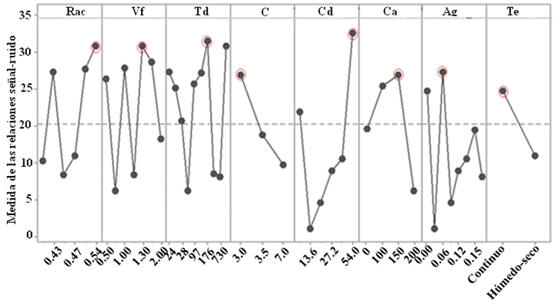 Le sigue la relación agua/cemento, el volumen de fibras, el tiempo de degradación y el ancho de fisuras controladas, siendo los niveles recomendados en cada caso para obtener mayores efectos en la disminución de la resistencia residual los siguientes: Cd (54 kN), Rac (0.54), Vf (1.3%), Td (176 días) y Ag (0.07 mm), respectivamente. Estos valores se obtienen tomando el valor del nivel más elevado en cada factor en la Figura 5, señalados con un círculo rojo. Por su parte, las demás variables se encuentran más cerca de la media y tienen un menor efecto sobre la relación de señal-ruido, no obstante, para llevar acabo un diseño experimental con el fin de obtener los mayores niveles de variación de resistencia residual también se deben tener en cuenta. Por lo tanto, en el caso de la concentración de cloruros, la corrosión acelerada y el tipo de experimento, los valores recomendados son 3%, 150 uA/cm2 y experimento continuo respectivamente.