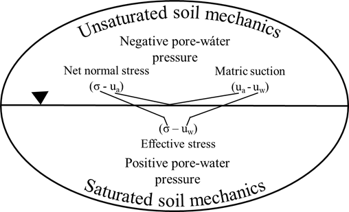 Figure 1 shows how the water table is the boundary between saturated and unsaturated soil. Under this level, the effective stress (σ-uw) is what governs the behavior of the soil; while, above the water table, there are two independent variables to consider: the total effort(σ-ua) and the matric suction (ua -uw).
