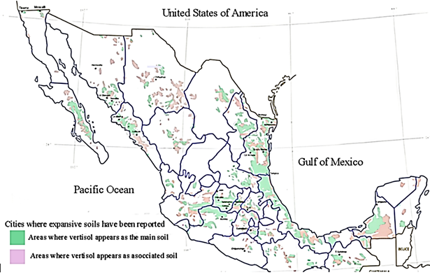In the Mexican Republic, it has been found that about 25% of the territory has vertisol on its surface as the main soil or as associated soil. Second or third, however, it is considered that only half of this percentage corresponds to environmental conditions that favor the expansive behavior that causes so much damage in construction. Figure 2 shows the regions of the Mexican territory where vertisol soils abound with the mineral montmorillonite as their main constituent.
