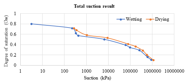 For the results of the suction of the soil, Figures 8 and 9 show the values of total suction and matric suction respectively where it can be seen that, the higher the value in the suction, the lower the moisture content in the specimen and vice versa; the higher the humidity, the lower the suction.