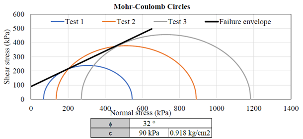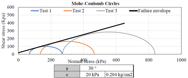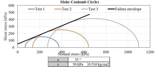 Once this value is obtained, a lower value and a higher value are obtained to have three different confinement stresses (0.68 g/cm2, 1.35 g/cm2 and 2.7 g/cm2) and to be able to obtain the friction and cohesion angle values in the soil using a Mohr graph.
