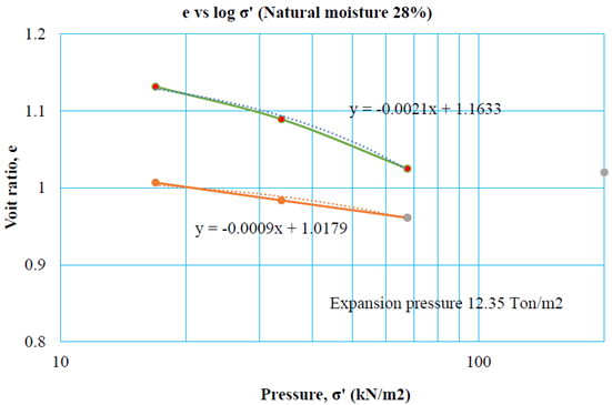 In addition, the expansion test is based on ASTM D 4546-2008 method B, which consists of placing an unaltered sample inside a consolidation ring in an odometer. An initial load is applied that is equal to the one in place and is saturated to allow the soil to expand. The test consists of loading several load intervals until the straight stretch of the compressibility curve is defined and then unloading the specimen in the same way in a period of 72 hours so that the swelling of the sample can finally be observed to obtain the change in volume, as well as the value of the expansion pressure.