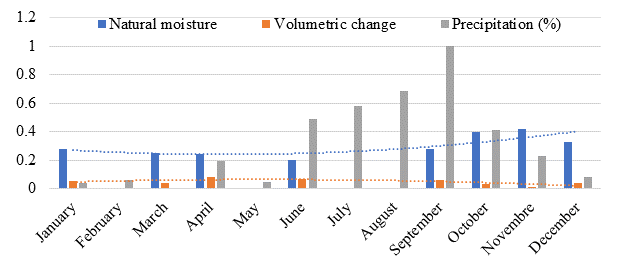Finally, to determine which period is recommended for initial self-construction, the work of Lezama, J. M. (2017), Antonio, Y. (2014), Montes, E. (2018) and the samples carried out for this work were taken into account to prepare the graph presented in Figure 16 that shows the natural water contents and the expected volumetric changes in a calendar year in order to compare them with the precipitation data of CONAGUA. To have the percentages of precipitation, the month of September is considered as 100%.