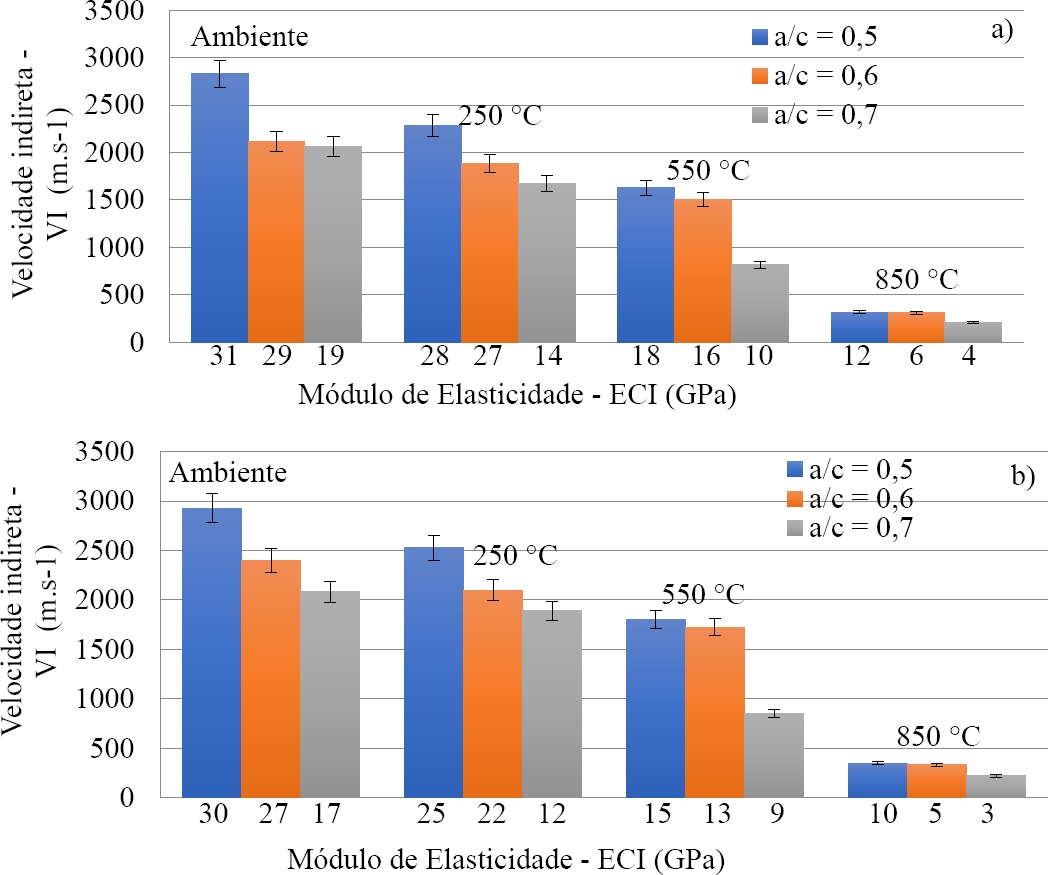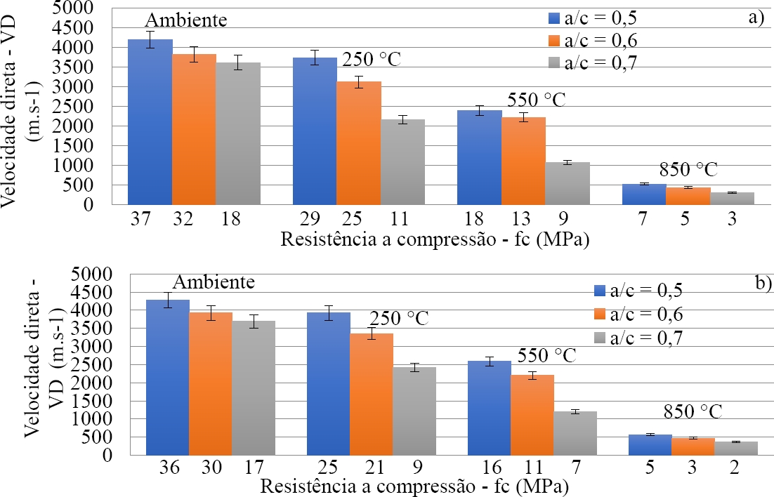 As velocidades diretas e indiretas para as amostras com fatores água-cimento (0,5 e 0,6), não obtiveram elevadas reduções para temperatura de 250˚C ambiente, em relação a ambiente, com variação (8 a 12%) para resfriamento lento, e (13 a 19%) para resfriamento brusco. A partir da temperatura de 550˚C e 850˚C é possível perceber uma acentuada redução de velocidade de propagação das ondas, para ambos os tipos de resfriamento. Entretanto as variações de velocidade direta e indireta foram elevadas, a partir de 250˚C, para o fator água-cimento (0,7), devido a maior evaporação de água no interior do concreto resultando em maior perda de massa, independentemente do tipo de resfriamento. Os valores encontrados entre as velocidades indiretas foram (30 a 37%), para os diferentes fatores água-cimento e patamares de temperatura.