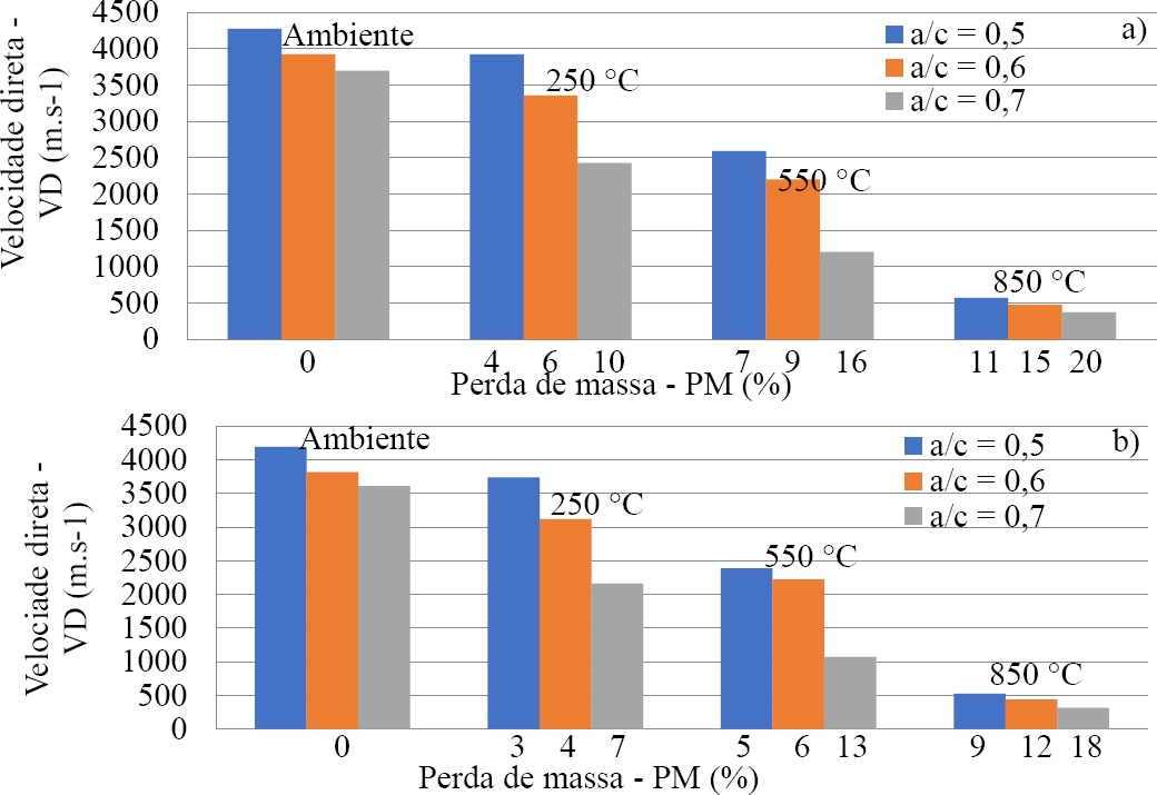 O aumento da porosidade ocasionado pela desidratação do silicato de cálcio hidratado (C-S-H), pode ser representado pelos resultados da perda de massa e velocidade direta e indireta de propagação de ondas (Figura 8 e 9), uma vez que quaisquer imperfeições no concreto, como rachaduras ou vazios contribui no aumento do tempo de propagação das ondas através do comprimento do corpo de prova, resultando em velocidades de pulso ultrassônicas mais baixas. A perda de massa ocorre de forma significativa nas amostras com fator água-cimento (0,5 e 0,6) para as temperaturas de 550˚C e 850˚C, e a partir de 250 ˚C fator água-cimento (0,7). Segundo Kirchhof et al. (2015) e Viana (2017) para temperaturas acima de 400 ˚C, o aumento da água livre nos poros do concreto acarreta o fenômeno de spalling explosivo, e maior perda de massa.