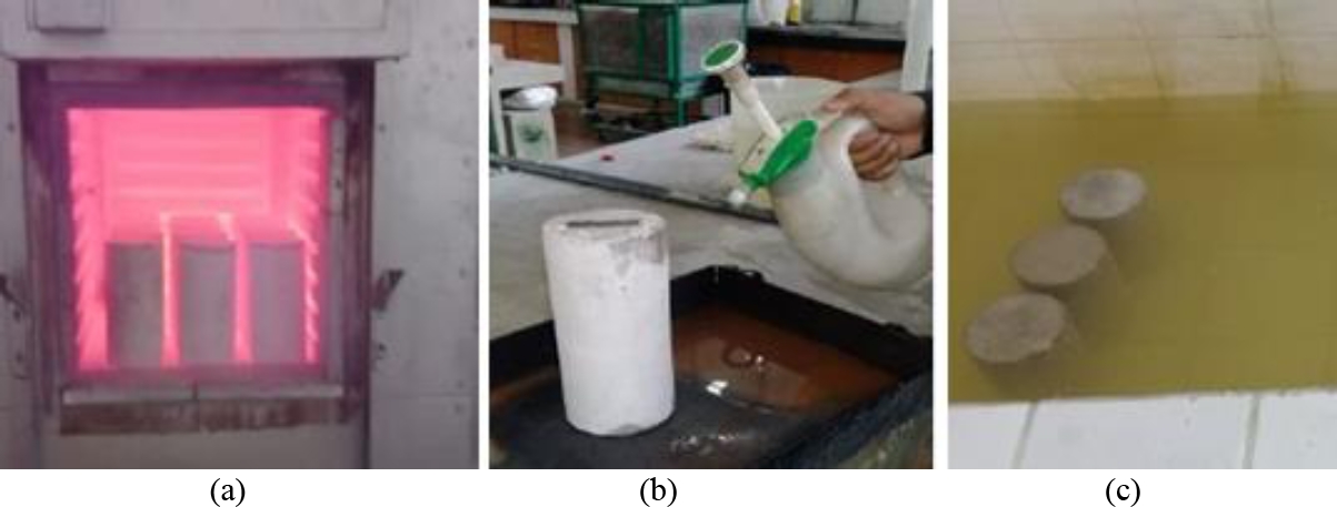 Figura 1. (a) muestras de hormigón en un horno de mufla, (b) enfriamiento lento con hormigón pulverizado, (c) enfriamiento repentino en un recipiente con agua. Autores (2023).