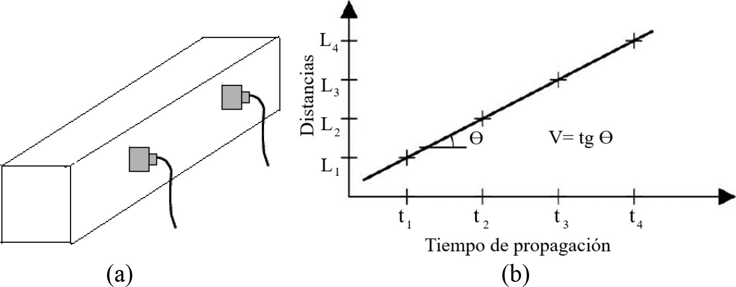 Figura 3. (a) Ensayo indirecto realizado en muestras prismáticas. (b) Determinación de la velocidad de propagación por el método indirecto. Fuente: ABNT-NBR 8802 (2019).