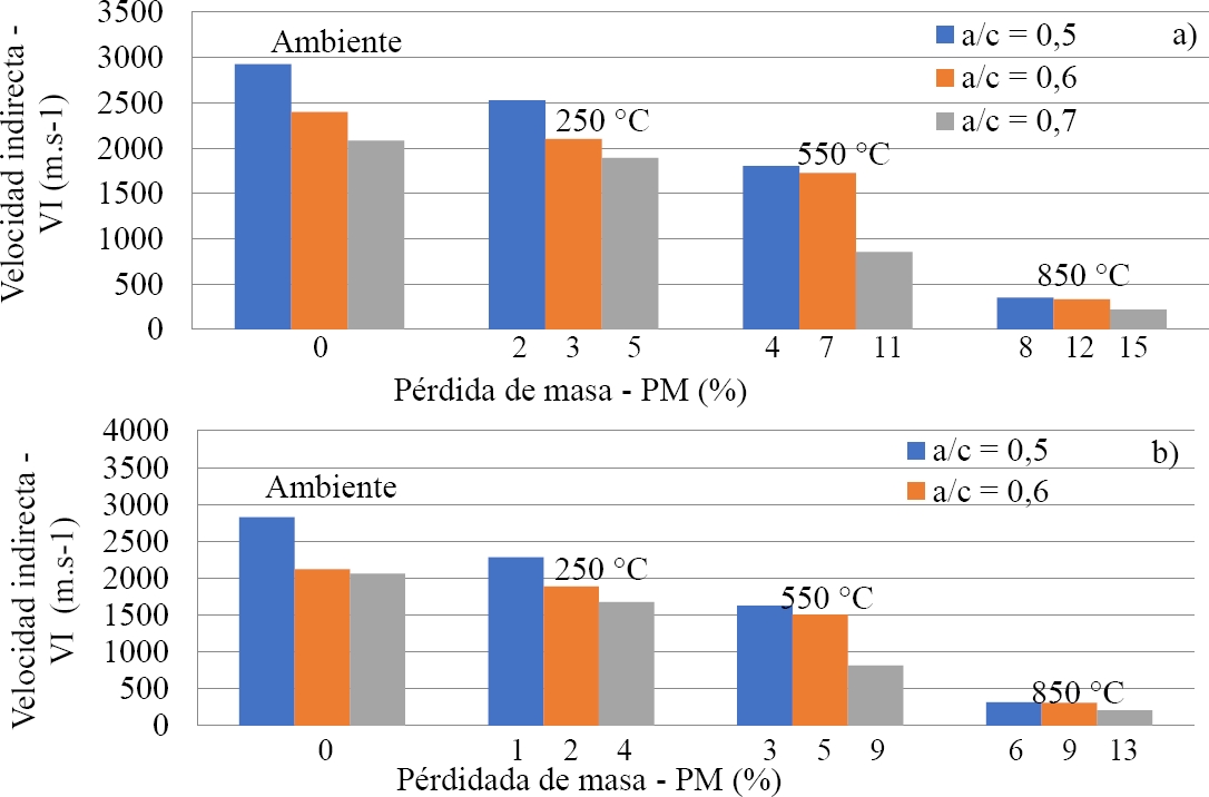 El aumento de la porosidad causado por la deshidratación del hidrato de silicato cálcico (C-S-H) puede representarse mediante los resultados de la pérdida de masa y la velocidad de propagación directa e indirecta de las ondas (figuras 8 y 9), ya que cualquier imperfección del hormigón, como grietas o huecos, contribuye a aumentar el tiempo de propagación de las ondas a través de la longitud de la probeta, lo que se traduce en menores velocidades de los impulsos ultrasónicos. La pérdida de masa se produce de forma significativa en muestras con un factor agua-cemento (0,5 y 0,6) a temperaturas de 550˚C y 850˚C, y a partir de 250 ˚C con un factor agua-cemento (0,7). Según Kirchhof et al. (2015) y Viana (2017), para temperaturas superiores a 400 ˚C, el aumento de agua libre en los poros del hormigón provoca un desconchamiento explosivo y una mayor pérdida de masa.
