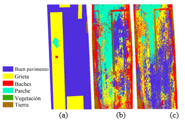 Píxeles de diferentes categorías, como buen pavimento y parches, presentaron tonalidades similares en algunas imágenes, lo que resultó en valores espectrales similares y, en consecuencia, en errores de clasificación. Se encontró que parte de los errores se produjeron por sombra y superposición de vegetación, lo que imposibilitó la clasificación de estas ubicaciones.