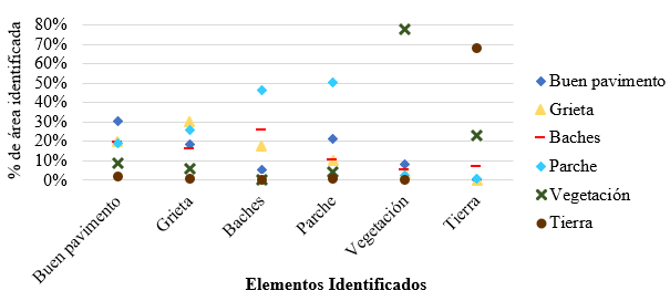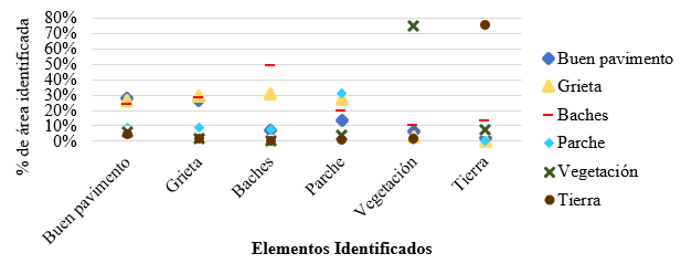 Se observa, en la Fig. 6, que las clases de suelo y vegetación presentaron mejores resultados, con porcentajes de aciertos superiores al 60 y 70%, respectivamente. Buen pavimento, grietas y parche presentaron valores entre 30 y 50%, lo que puede entenderse como un mal resultado. Los baches presentan el peor resultado, con un acierto de aproximadamente el 25%, además de tener un mayor número de áreas clasificadas erróneamente como parches.