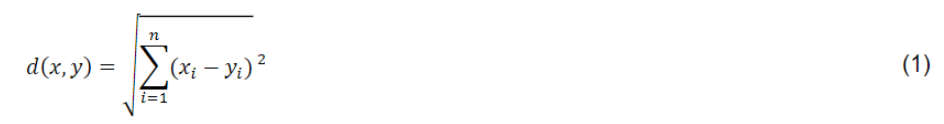 Donde d x , y es la Distancia Euclidiana; x i : Vector de firma espectral de la imagen de píxeles; y i : Vector de firma espectral del área de una muestra; n: Número de bandas en la imagen.