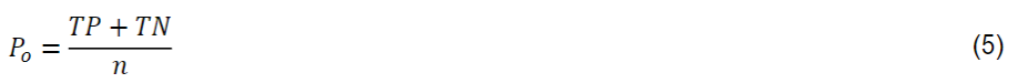 Donde P o es la proporción de concordancia observado, o precisión general, y P c es la proporción de concordancia casual o aceptación total. El término 푃 푂 viene dado por la siguiente división: