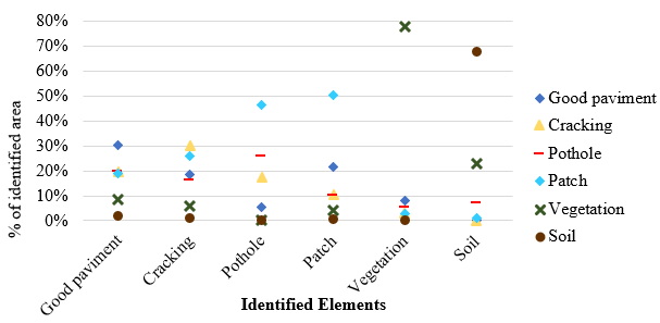 Fig. 6 shows that the land and vegetation classes presented better results, with percentages of correct answers more significant than 60 and 70%, respectively. Good pavement, cracks, and patches presented values between 30 and 50%, understood as a bad result. The pans present the worst result, with a hit of approximately 25% and a higher number of areas erroneously classified as patches.