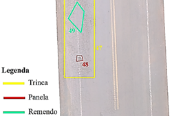 No total, cinco patologias anotadas no levantamento por caminhamento não foram identificadas nas imagens obtidas pela RPA. A área de remendos, panelas e trincas, observada na coleta por caminhamento, foi de 1.759,45 m², enquanto no levantamento manual foi de 1.638,42 m², resultando na identificação de 93,1% das patologias. A porcentagem foi calculada com base em medidas geométricas registradas em croquis, com escala, no levantamento por caminhamento.