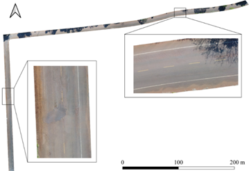 Após a realização do voo e o processamento das imagens obtidas no levantamento com a RPA, gerou-se um ortomosaico final (Fig. 4). O GSD foi de 1,39 centímetro por pixel. Com o objetivo de otimizar a classificação foram recortados da imagem as bordas excedentes que continham os arredores além dos limites da faixa de rolamento da via.