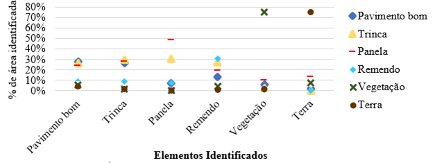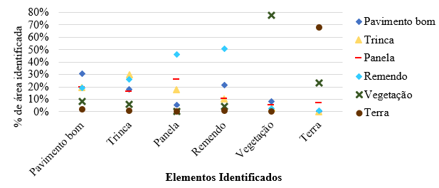 Observa-se, na Fig. 6, que as classes terra e vegetação apresentaram melhores resultados, com porcentagem de acerto maiores que 60 e 70%, respectivamente. O pavimento bom, trincas e remendo apresentaram valores entre 30 e 50%, o que pode ser entendido como um resultado ruim. As panelas apresentam o pior resultado, com acerto de aproximadamente 25%, além de terem uma quantidade superior de áreas classificadas erroneamente como remendo.
