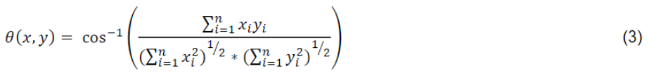 Onde θ x , y é o Ângulo espectral; x i : Vetor de assinatura espectral da imagem de pixel; y i : Vetor de assinatura espectral da área de uma amostra; n: Número de bandas da imagem.