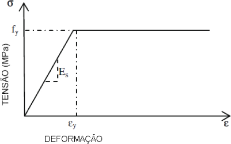 Em aplicações gerais de Engenharia, é normalmente adotado um diagrama elasto-plástico perfeito, idêntico na tração e compressão, conforme a Figura 3. Esse modelo, segundo Obaidat, Heyden e Dahlblom (2010), apresenta resultados aceitáveis na modelagem de elementos no concreto armado.
