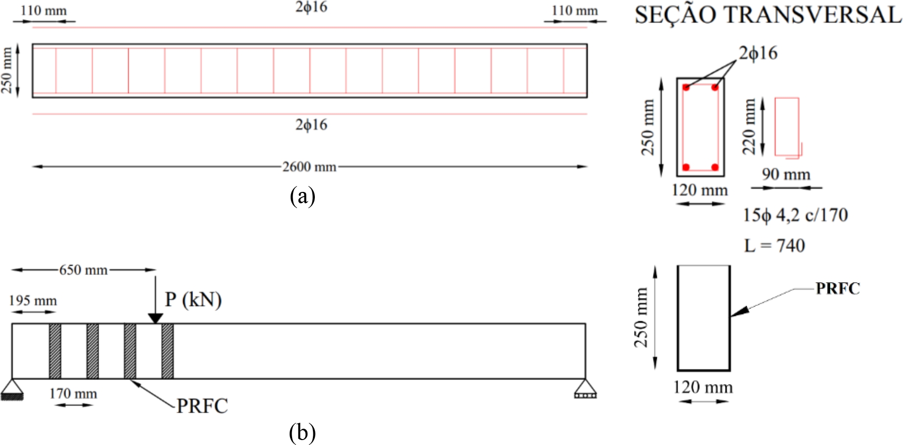 O aço usado experimentalmente para os estribos foi o CA-60, com uma tensão de escoamento média de 618,63 MPa. As barras longitudinais foram da categoria CA-50 e tensão de escoamento média de 581,37 MPa. O Coeficiente de Poisson a ser adotado foi de 0,3 e o módulo de elasticidade de 190 GPa. O tipo de reforço utilizado foi o SikaWrap300 C, ou seja, uma manta de PRFC (Polímero Reforçado com Fibra de Carbono). Tal produto possui espessura de 0,167 mm e largura de 50 mm, com módulo de elasticidade de 230 GPa. O material utilizado para a colagem do tecido no substrato de concreto foi o Sikadur330.