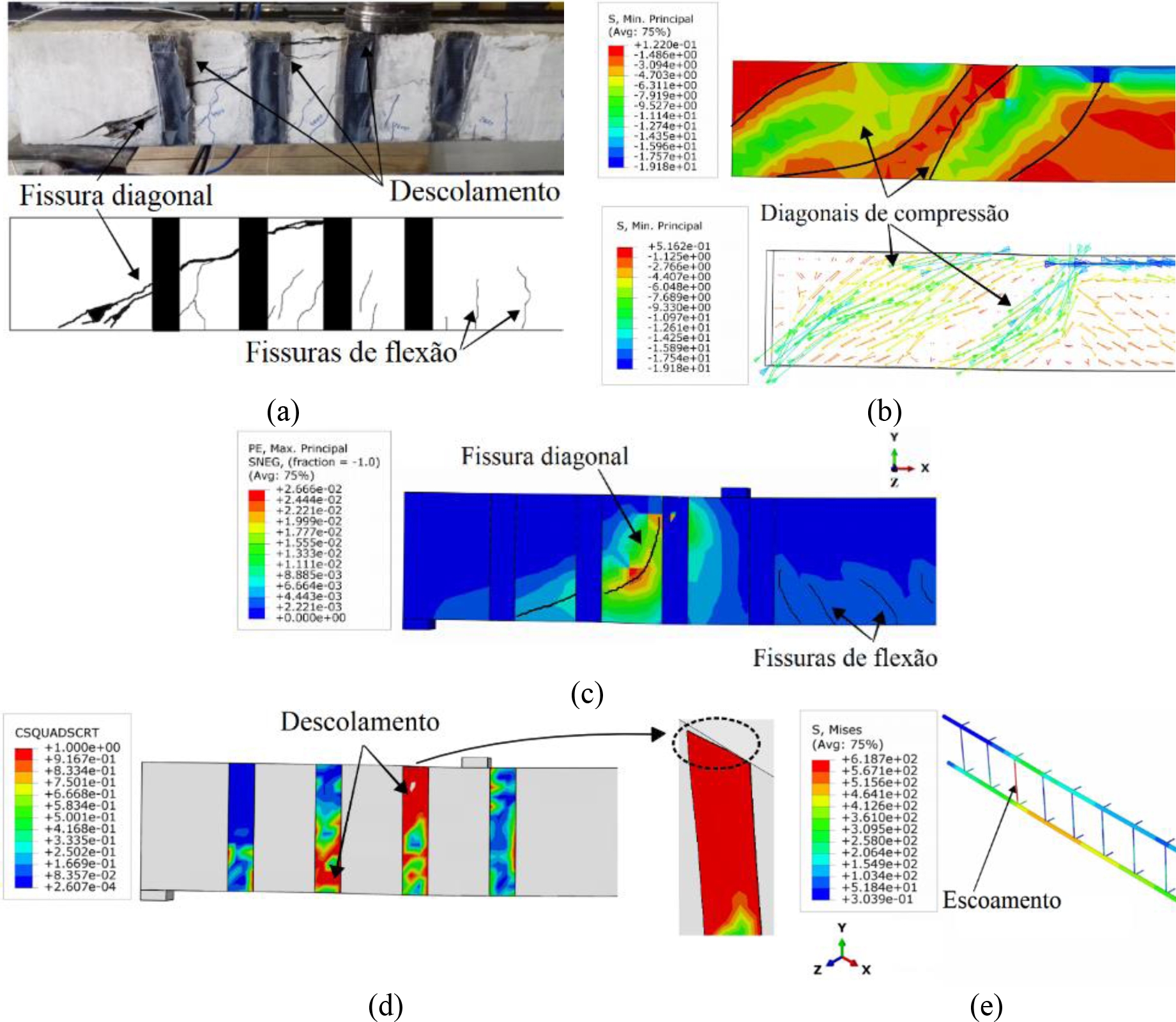 Na Figura 10 são apresentados os modos de ruptura das vigas reforçadas ao cisalhamento, assim como as regiões críticas de fissuração e tensões no aço. Foi observada a formação de duas diagonais de compressão na viga VC0-90, fato diferente na viga VCR, onde houve a formação de apenas uma diagonal de compressão (Figura 8b). Com a Figura 10d, nota-se regiões de descolamento, muito semelhante aos resultados experimentais, assim como as regiões de fissuração, onde o descolamento é representado pela cor vermelha (dano igual a 1,0) (Obaidat, Heyden e Dahlblom, 2010). Segundo Arcine, Menon e Krahl (2023) e Pellegrino e Modena (2008), a posição do reforço frente aos estribos pode afetar a capacidade resistente da viga reforçada. Isso ocorre pois quando posicionado entre estribos internos, o PRFC irá proporcionar confinamento e aumentar assim a capacidade resistente da viga, o que não ocorre quando posicionado sobre estribos.