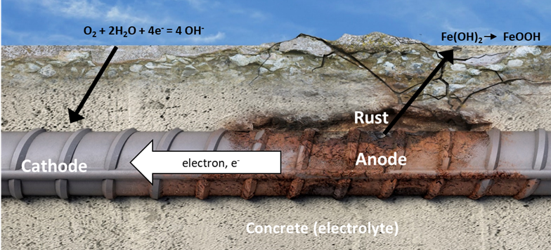 The corrosion of steel reinforcing bars embedded in concrete behaves in the same way as the corrosion of a metal in electrolyte solutions, corrosion always occurs at the anodes as described in the figure 1.
