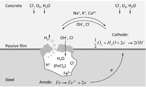 However, due to the natural process of carbonation, the concrete can progressively lose its high alkalinity, or due to the localized action of chlorides the stable iron oxides can be broken down, meaning that the steel reinforcing bars are no longer in a passive environment, and they can start to corrode.