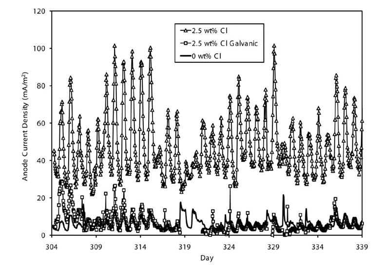 Some issues (Holmes et al, 2011) have been raised regarding the efficiency of this system especially in concrete structures with heavy existing corrosion. When running purely in galvanic mode, in the presence of high chlorides, it has been found that the anode current output is the same as the current output of anodes placed in concrete with no chlorides present. This means that the effectiveness of discrete anodes might be limited if used to stop on-going corrosion in area of high chloride induced corrosion.