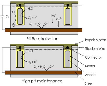 During the induced current phase (typically used initially for 1 to 2 weeks depending on the voltage used), the steel reinforcement is re-passivated by the formation of hydroxide ions due to the induced current output, whilst chlorides are removed from the surrounding pore liquid. Once the steel is back in passivated form, the current is switched of, and the anodes are then connected so the system can run in pure galvanic mode.