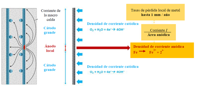 La corrosión de las armaduras de acero embebidas en el concreto se comporta de la misma manera que la corrosión de un metal en soluciones electrolíticas, la corrosión se produce siempre en los ánodos como es descrito en la figura 1.