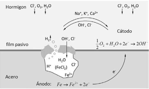 Sin embargo, debido al proceso natural de carbonatación, el concreto puede perder progresivamente su alta alcalinidad, o debido a la acción localizada de cloruros los óxidos de hierro estables pueden descomponerse, lo que significa que las barras de acero de refuerzo ya no están en un ambiente pasivo, y pueden comenzar a corroerse.