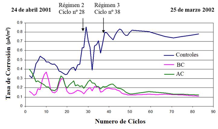 Como muestran Heiyandtuduwa (Heiyantuduwa, 2006) y Taché (Taché, 2000) (véase la figura 9 donde se nota una reducción fuerte de la corrosión con el efecto de los inhibidores que son aplicados antes o después de la carbonatación acelerada), esta tecnología funciona mejor en concreto armado con corrosión del acero inducida por carbonatación por tres razones principales: