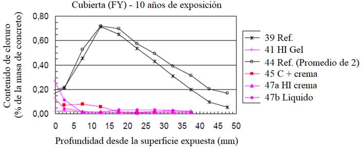 Estos inhibidores pasivos de la corrosión son muy eficaces para evitar la migración de cloruros en el concreto. Eva Rodum (Rodum, 2012) ha realizado pruebas en estructuras existentes y ha demostrado que las impregnaciones hidrófobas de diferente forma son muy eficaces para evitar la migración de cloruros, incluso 10 años después de su aplicación (véase la figura 10) donde el concreto de referencia tiene un contenido de cloruros muy elevado mientras que los hormigones tratados con los diferentes tratamientos hidrofóbicos tienen niveles de cloruros cercanos a cero. Los estudios realizados por M. Brem (Brem, et al 2022) durante un periodo de 11 años muestran que la velocidad de corrosión y la resistividad eléctrica del concreto están muy bien correlacionadas, lo que confirma que la reacción de corrosión está controlada principalmente por el contenido de humedad del concreto a nivel de la armadura de acero. En este estudio, un silano en crema fue aplicado en el concreto dejando una parte sin aplicación como referencia. Se han instalado sistema de monitoreo que permiten medir la resistividad a diferente profundidad en el concreto y la actividad de corrosión de las armaduras. Después de 11 años, no hay penetración de humedad en la zona tratada (en azul in la figura 11) con una actividad de corrosión casi nula. Del otro lado, se nota una actividad de corrosión alta y grande humedad en la zona no tratada (en negra en la figura 11). Este estudio también muestra la ventaja positiva de este tratamiento con silano en términos de longevidad y protección contra la corrosión.