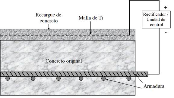 La protección contra la corrosión se consigue colocando un ánodo, por ejemplo, de malla de titanio, en la superficie del concreto y conectado directamente a la red de armaduras (consulte la figura 12).