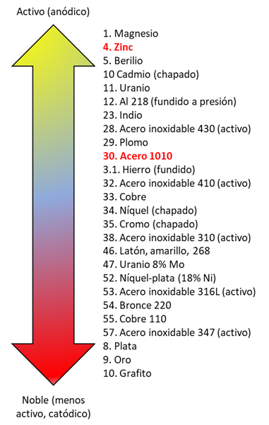 La protección galvánica contra la corrosión del acero en el concreto se basa en la formación de un elemento galvánico si un metal menos noble que el acero (figura 13), en contacto directo con el recubrimiento de concreto, se conecta eléctricamente a las barras de acero de refuerzo. El acero de refuerzo queda protegido de la corrosión mientras fluya suficiente corriente galvánica entre el elemento galvánico (que actúa como ánodo) y la armadura de acero (que actúa como cátodo). Lo más habitual es utilizar zinc como elemento de sacrificio/material anódico. La célula galvánica que se forma corresponde a una pila convencional de zinc/aire. La primera aplicación conocida de un sistema galvánico de protección contra la corrosión para el concreto armado fue en el tablero de un puente en Illinois en 1977.