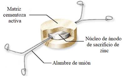 Estos ánodos se colocan y embeben en la zona de reparación del parche (figura 14), y necesitan usar un mortero con una resistividad específica para rellenar el parche (Lozinguez, et al 2018; Christodoulou, et al 2014), o dentro del concreto que rodea la zona de reparación del parche (Figura 15). La eficiencia de esos ánodos no depende de la resistividad del mortero que se usa para rellenar el parche (Lozinguez, et al 2018; Christodoulou, et al 2014) para resolver el problema de la corrosión incipiente de los ánodos.
