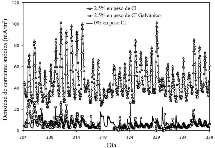 En el estudio mencionado previamente, Holmes (Holmes et al, 2011), figura 18 comparó la actividad de un ánodo de zinc en concreto que contenía un 2,5% de cloruro, funcionando al 100% en modo galvánico, con el mismo ánodo que previamente había sido activado durante una semana por una corriente externa. Estos dos sistemas se compararon con la actividad del mismo ánodo galvánico colocado en concreto sin cloruros. El estudio muestra que el ánodo que funciona en modo galvánico puro genera tanta corriente como el ánodo colocado en concreto sin cloruros, lo que demuestra su ineficacia para proteger el acero. Mientras que el ánodo que ha sido previamente activado es muy activo, debido a la presencia de estos cloruros. Se sacrifica en lugar del acero circundante (véase la figura 19).