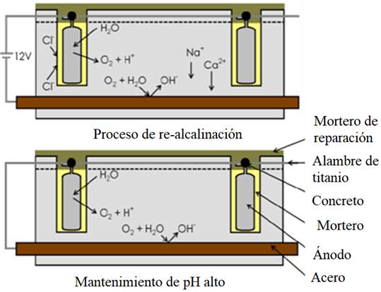 Durante la fase de corriente inducida (que suele utilizarse inicialmente durante 1 o 2 semanas, en función de la tensión utilizada), la armadura de acero se vuelve a pasivar mediante la formación de iones de hidróxido debido a la salida de corriente inducida, mientras que los cloruros se eliminan del líquido poroso circundante. Una vez que el acero vuelve a estar pasivado, se desconecta la corriente y se conectan los ánodos para que el sistema funcione en modo galvánico puro.