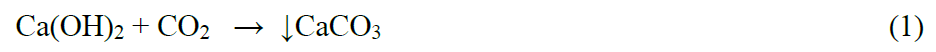 Cuando el dióxido de carbono atmosférico se encuentra con la cal hidratada en la solución de poro del concreto no carbonatado, se produce una reacción de carbonatación, y el hidróxido de calcio altamente alcalino (Ca(OH)2 con un pH ~13), procedente de la cal hidratada, se convierte en carbonato de calcio poco alcalino (pH ~9), relativamente insoluble, como se aprecia en la ecuación 1: