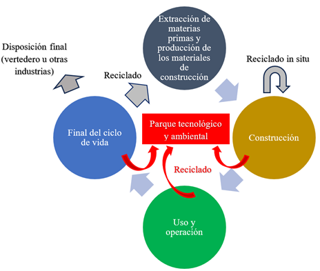Con el fin de discutir la integración de la EC en la ICC es necesario conocer algunos modelos propuestos en la literatura, entre los cuales destaca el trabajo de Maury-Ramírez y col. (2022) que evalúa los procesos de la industria de la construcción con el fin de mejorarlos a partir del análisis del proceso de explotación de las materias primas y la manufactura de los materiales de construcción, la etapa de edificación de la infraestructura, el uso y operación del inmueble, así como el final de la vida útil que incluye la generación de los desechos y su disposición final en un vertedero o el reciclado dentro de esta industria u otra (Figura 1). Este modelo se empleó en Santiago de Cali (Colombia), pero podría extenderse a las variables relacionadas con el cemento y concreto, involucrando las etapas de producción, diseño, construcción, uso, mantenimiento y gestión del término de la vida útil.