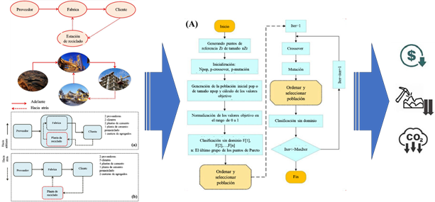 Otra ventaja es que permite el seguimiento del material (trazabilidad) y la gestión eficiente en el proceso de suministro por medio de actividades de rastreo desde la planta de producción hasta el lugar de la construcción, lo cual incluye el conocimiento preciso de los volúmenes utilizados, tiempos de entrega y otras variables. M. NoParast y col. (2021) desarrollaron un modelo para optimizar la cadena de manufactura y suministro de concreto que consiste en el análisis de diferentes subsistemas: los clientes, proveedores, así como las locaciones de la manufactura y reciclaje. El objetivo fue minimizar la extracción de materias primas, el costo de transportación y las emisiones de efecto invernadero (Figura 2).