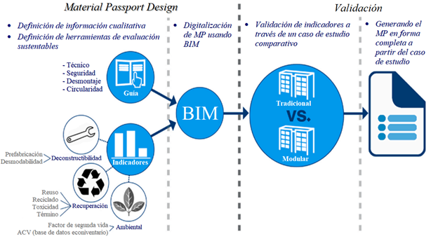 Por otra parte, el Building Information Modeling (BIM) y la impresión 3D son componentes importantes de la digitalización. La primera es una metodología que permite crear modelos digitales tridimensionales de edificios, infraestructuras y proyectos de construcción, que contienen información detallada de los elementos de construcción tales como los parámetros de diseño, tipo de concreto, dimensiones de las estructuras y ubicación en la edificación, características de las instalaciones, etc. (Sudarsan y col., 2023). Así, BIM posibilita optimizar la planificación, diseño y gestión del proyecto, que es afectado por las variables asociadas al uso de cemento y concreto en la logística de suministro, simulación y análisis estructural, procedimientos constructivos, etc.; esto permite una mejor toma de decisiones que reduce los errores durante la construcción (Atta y col., 2021). Cabe resaltar que BIM facilita la comunicación y colaboración entre los actores del proyecto porque permite acceder y actualizar la información del modelo en tiempo real (Atta y col., 2021; Sudarsan y col., 2023), optimizando el uso del cemento y concreto, los desechos y los tiempos de construcción. I. Atta y col. (2021) propuso un método de diseño sustentable basado en la herramienta de Material Passport (MP) (Figura 3), el cual requiere de parámetros de entrada como las herramientas para la evaluación de la sustentabilidad, detalles técnicos del material y establecer los indicadores para determinar la disposición final; con estos datos se diseña el MP que es digitalizado mediante BIM y la información se procesa para validar las características de manufactura y del caso específico de estudio donde se utilizará el material.