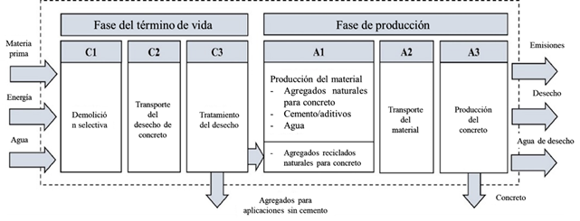 | Figura 4. Modelo para el análisis ciclo de vida de concreto reciclado (Mostert y col., 2021). | ||||