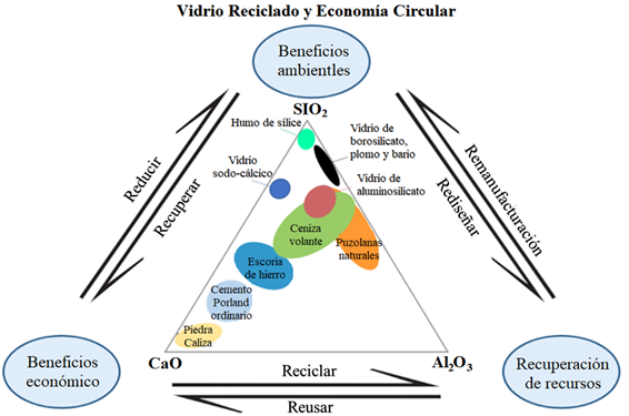 Cabe mencionar que la utilización de agregados reciclados requiere un adecuado proceso de selección, clasificación y procesamiento para asegurar su calidad, cumpliendo los requisitos de resistencia, durabilidad y otras propiedades de interés del concreto (Al-Sinan y col., 2022; Althoey y col., 2022; Díaz-Aguilera y col., 2021). Un ejemplo de la implementación de la EC y agregados reciclados de vidrio fue publicado por M. Nodehi y col. (2022). La Figura 5 es un modelo triangular que relaciona los beneficios ambientales con los económicos y la recuperación de recursos a partir del concepto de las 6Rs: remanufactura, rediseño, reciclado, reuso, recuperación y reducción del desecho.