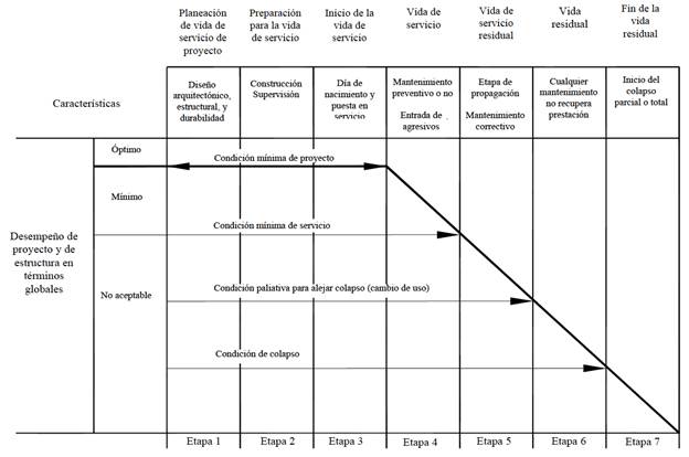 | Figura 6. Modelo esquemático de vida útil de 7 etapas (Castro y Helene, 2007). | ||||