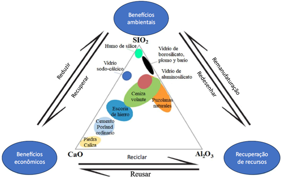 Vale ressaltar que a utilização de agregados reciclados requer um processo adequado de seleção, classificação e processamento para garantir sua qualidade, atendendo aos requisitos de resistência, durabilidade e outras propriedades de interesse do concreto (Al-Sinan et al., 2022; Althoey et al., 2022; Díaz-Aguilera et al., 2021). Um exemplo de implementação de agregados de vidro reciclado foi publicado por M. Nodehi et al. (2022). A Figura 5 é um modelo triangular que relaciona os benefícios ambientais com os benefícios económicos e a recuperação de recursos com base no conceito dos 6Rs: refabricação, redesenho, reciclagem, reutilização, recuperação e redução de resíduos.