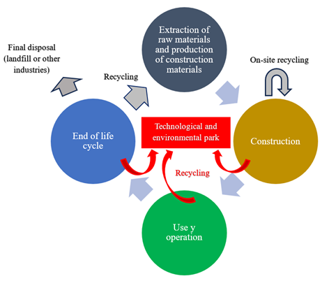 In order to discuss the integration of the CE into the CCI, it is necessary to explore some models proposed in the literature, among which the work of Maury-Ramírez et al. (2022) stands out. This work assesses the processes within the construction industry with the aim of improving them based on the analysis of the process of exploitation of raw materials and the manufacture of construction materials, the stage of infrastructure construction, the use and operation of the property, as well as the end of its useful life, which includes the generation of waste and its final disposal in a landfill or recycling within this industry or other sectors (Figure 1). This model was applied in Santiago de Cali (Colombia), but it could be extended to variables related to cement and concrete, encompassing the stages of production, design, construction, use, maintenance, and end-of-life management.